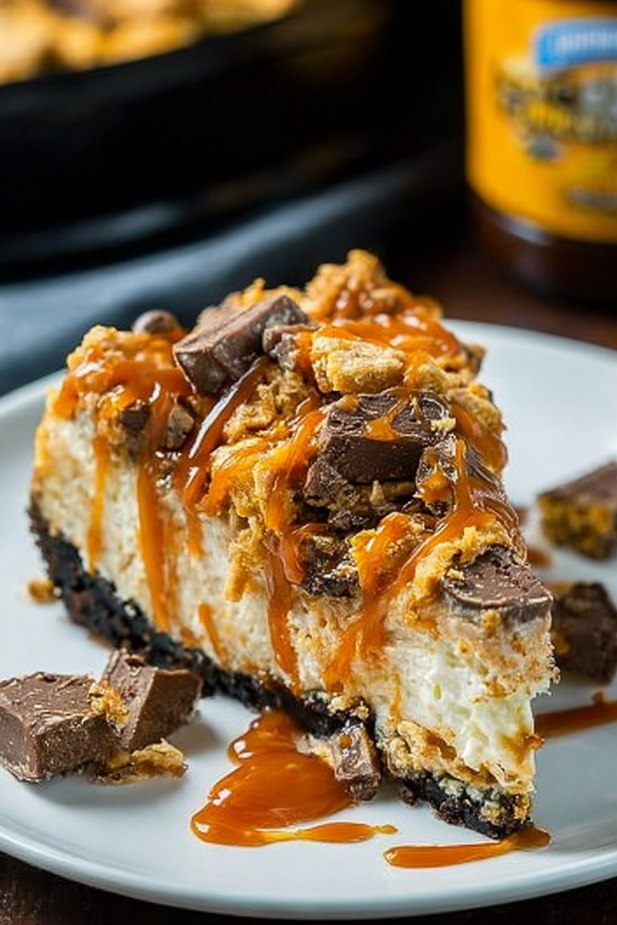Imagine sinking your fork into a creamy, dreamy cloud of Butterfinger Cheesecake with Caramel Drizzle. The rich cheesecake filling, the irresistible crunch of Butterfinger, and that luscious caramel swirl—pure bliss!
