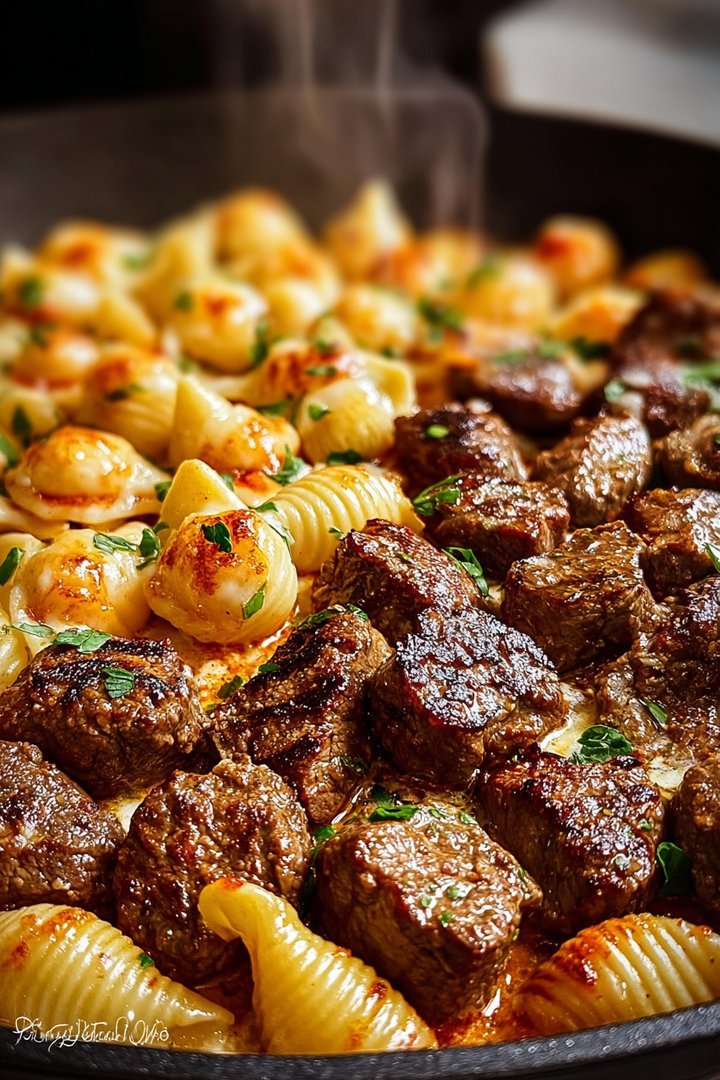Cajun Steak Bites and Cheesy Garlic Shells Skillet