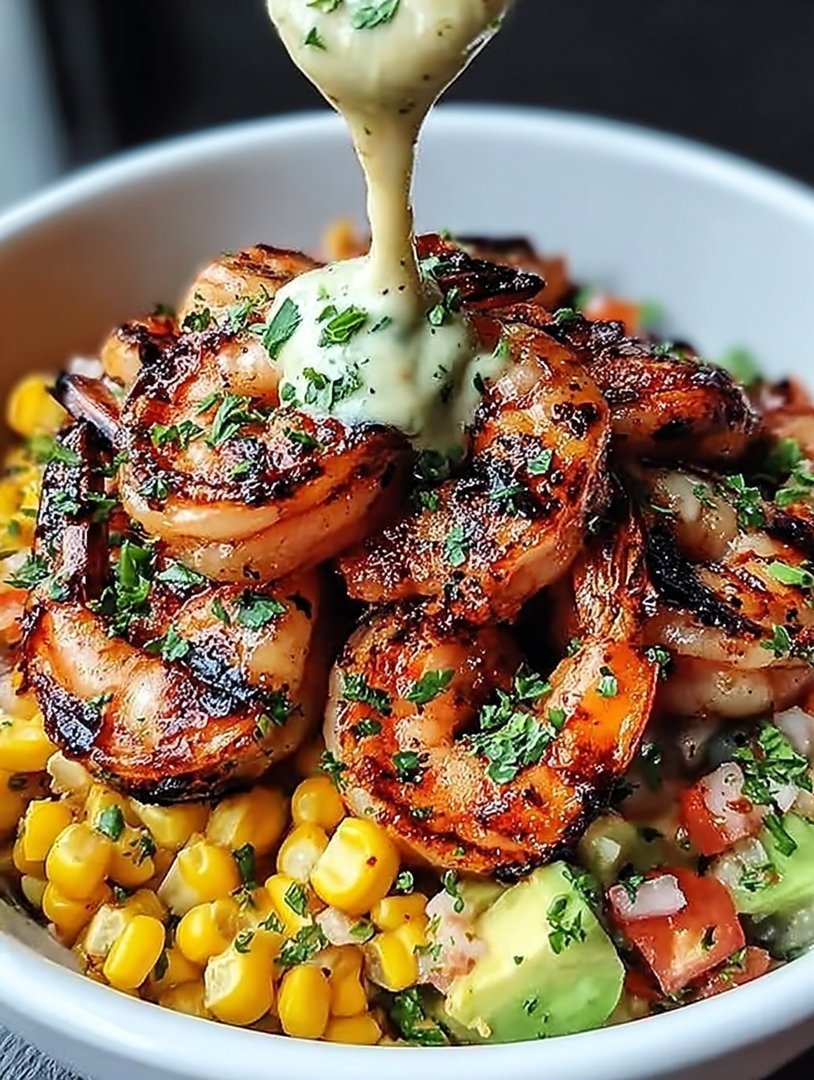 Grilled Shrimp Bowl with Avocado, Corn Salsa & Creamy Garlic Sauce: An Incredible Ultimate Recipe