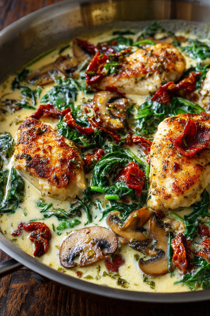 Add the spinach to the sauce and cook until wilted, about 2-3 minutes. Return the seared chicken breasts to the skillet, ensuring they’re coated in the creamy sauce. Simmer for another 5-7 minutes until the chicken is cooked through.