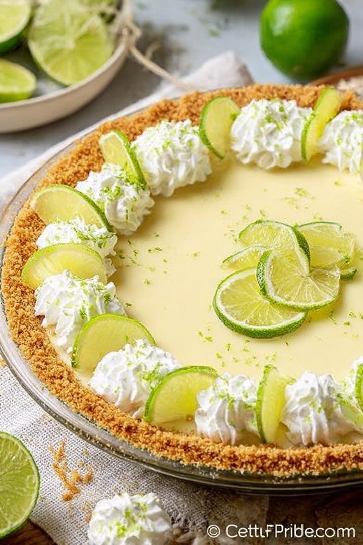 6. Step 6: Let the pie cool completely at room temperature, then refrigerate for at least 2 hours before serving. Top with whipped cream and lime slices, if desired.
