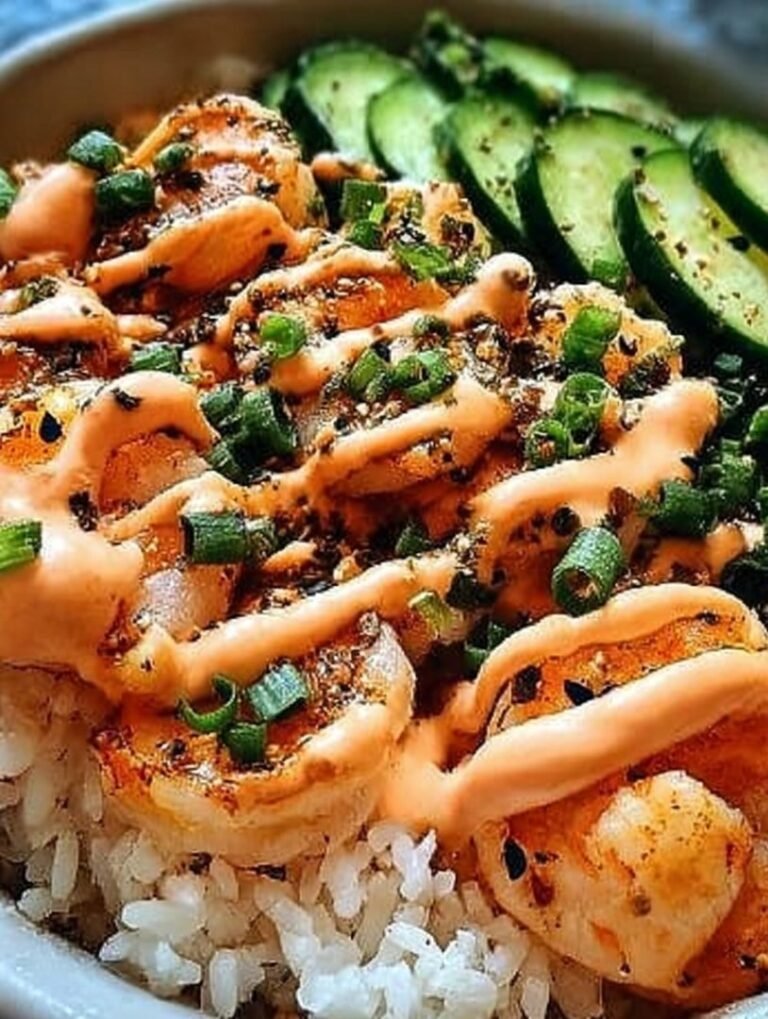 Divide the cooked rice evenly among bowls. Top with the cooked shrimp, sliced avocado, diced cucumber, and sliced green onions. Drizzle generously with the spicy mayo.