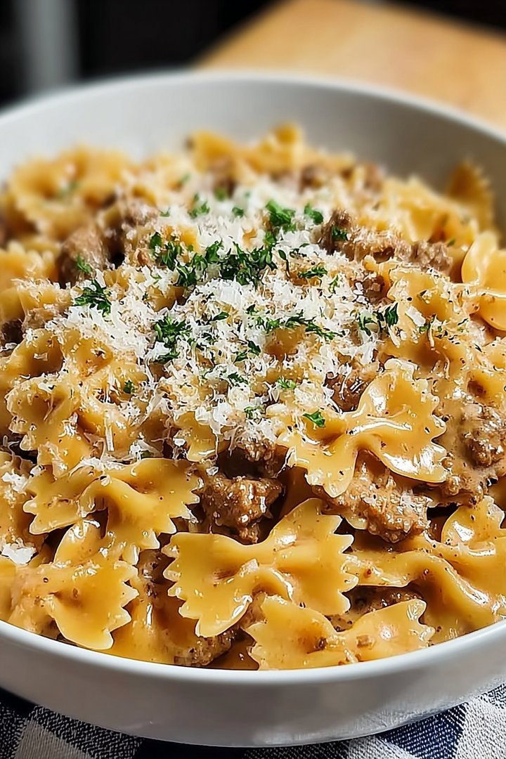 Garlic Parmesan Bowtie Pasta With Creamy Beef