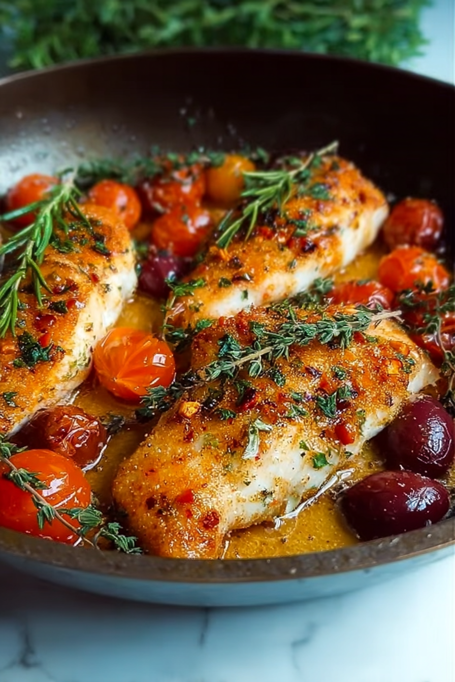 • White Fish Fillets Use a firm, white fish such as cod, halibut, or sea bass. These types of fish hold up well during baking and provide a mild flavor that complements the Mediterranean flavors.
