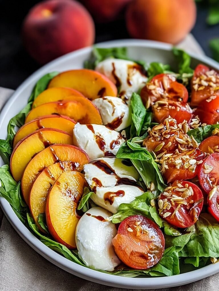 - **Dessert:** Believe it or not, this salad can even be served as a light dessert! The sweetness of the peaches and the tanginess of the balsamic glaze make for a surprisingly satisfying combination.