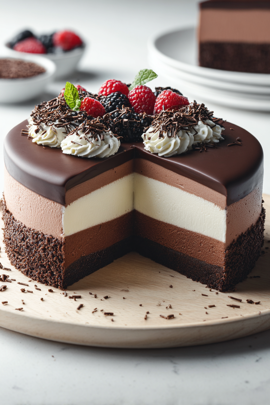 Delicious triple chocolate mousse cake recipe with detailed instructions and nutritional information.